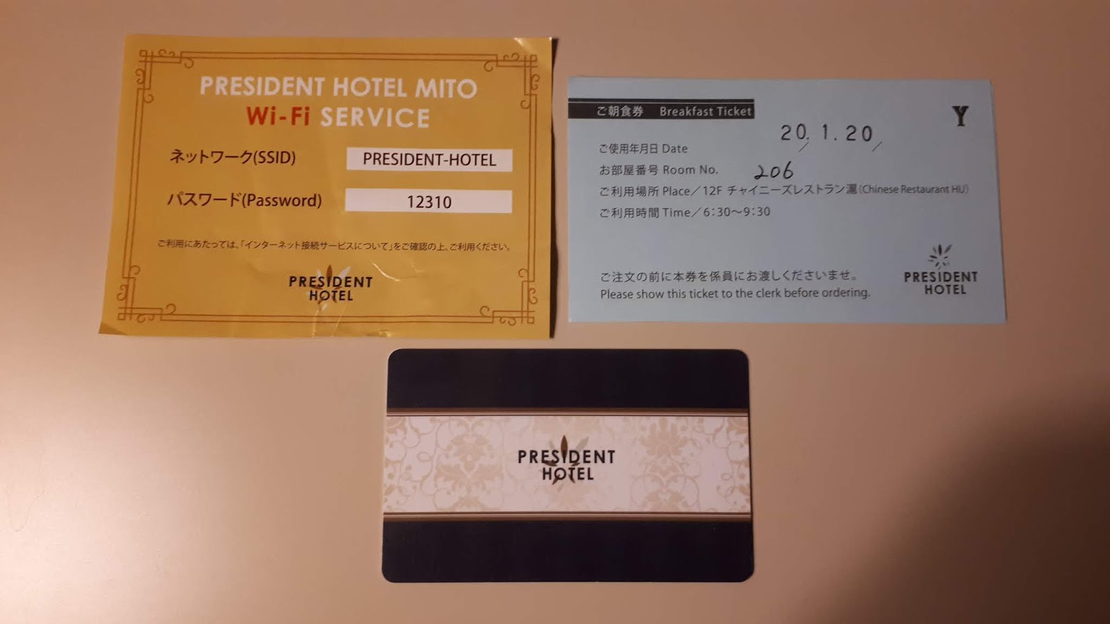 房卡.免費WIFI密碼.隔天早餐卷